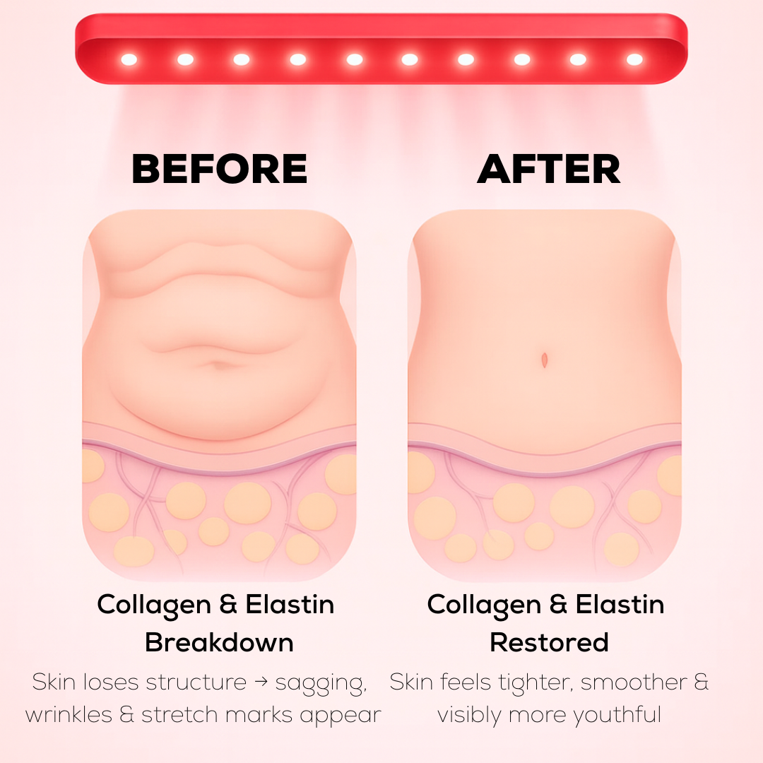 Our Dual-Wave Red Light Therapy Belt boosts collagen and elastin production, helping tighten loose belly skin, fade stretch marks, and smooth out wrinkles all without surgery. See visible results in weeks and feel confident in your skin again.