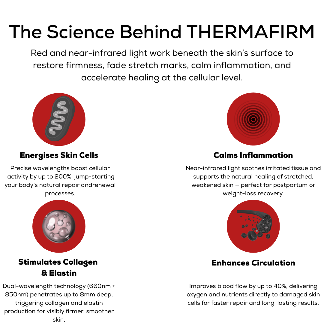 THERMAFIRM uses the same red and near-infrared wavelengths trusted by dermatologists and physiotherapists worldwide. Backed by clinical studies, this technology stimulates collagen, improves circulation, and calms inflammation helping your skin recover faster and look firmer. Finally, you can experience professional level results without stepping foot in a clinic.